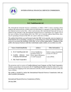 The International Financial Services Commission of Belize (“IFSC”) issues warnings about dealing with named persons, whether these are individuals or companies, to alert the public and the financial services sector that, where such persons offer international financial services as defined in the Schedule of the International Financial Services Commission Act, Chapter 272 of the Laws of Belize, Revised Edition 2011 ( the “IFSC Act”), from the address listed below, they may be operating in breach of the IFSC Act and/or other laws of Belize.
