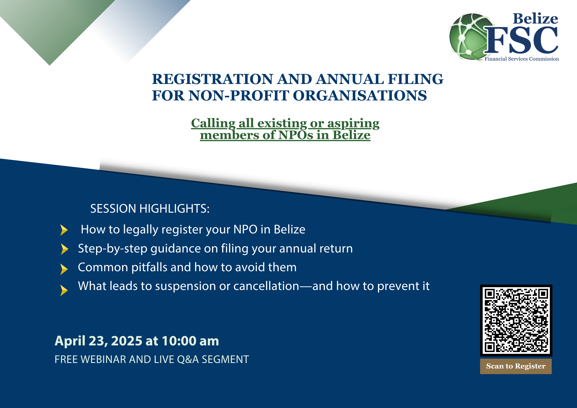 On Wednesday, April 23, 2025, the Financial Services Commission (FSC) hosted an informative and well-attended webinar focused on the Registration and Annual Filing Requirements for Non-Profit Organisations (NPOs) operating or intending to operate in Belize.