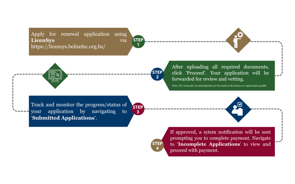 The opening date for renewal is 1st October in any given year. Licence holders are encouraged to submit the renewal application earliest, but no later than 31st December. If the renewal application is not submitted before the existing license expires, the license shall be automatically revoked and penalty fees will apply pursuant to Section 32 of the Financial Services Commission Act, Act No. 8 of 2023.