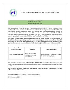 The International Financial Services Commission of Belize (“IFSC”) issues warnings about dealing with named persons, whether these are individuals or companies, to alert the public and the financial services sector that, where such persons offer international financial services as defined in the Schedule of the International Financial Services Commission Act, Chapter 272 of the Laws of Belize, Revised Edition 2011 ( the “IFSC Act”), from the address listed below, they may be operating in breach of the IFSC Act and/or other Laws of Belize.