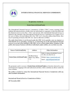 The promoters and/or owners of Oracle Stone Ltd (Grand Trade) are therefore directed to cease and desist from engaging in the said unlicensed activities, which constitute an offence under the Laws of Belize.